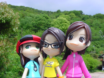 左から,たまえ,スゥ,よしこ。 新緑の季節にちょっと3人でハイキングというシチュエーションで撮ってみました。背景は自宅から50mほど歩いたところ。一見,とんでもない山の中のように見えますが,背後は普通の住宅街です。 頭が重くてすぐこけてしまうので左手で3人を持って右手のみでカメラを操作するという超ローテクで撮影しています。3人に身長差があるように見えるのは左手でまとめて握っているからです。ははは・・・。 何の偶然か晴天の午後であったにも関わらずほどほどのコントラストで撮れているのはラッキーでした。 |