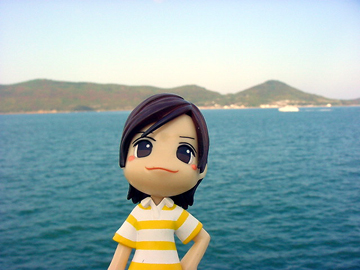 よ:フェリーは,小豆島に向けて快調に航行中。途中で女木島,男木島,大島,豊島のそばを通るんだよ。今,後ろに写っているのは,女木島だね。桃太郎の鬼が島伝説があるところだし,映画"釣りバカ日誌"でハマちゃんが女木島に転勤して来てフェリーで高松まで通勤するシーンがあるよ。 |